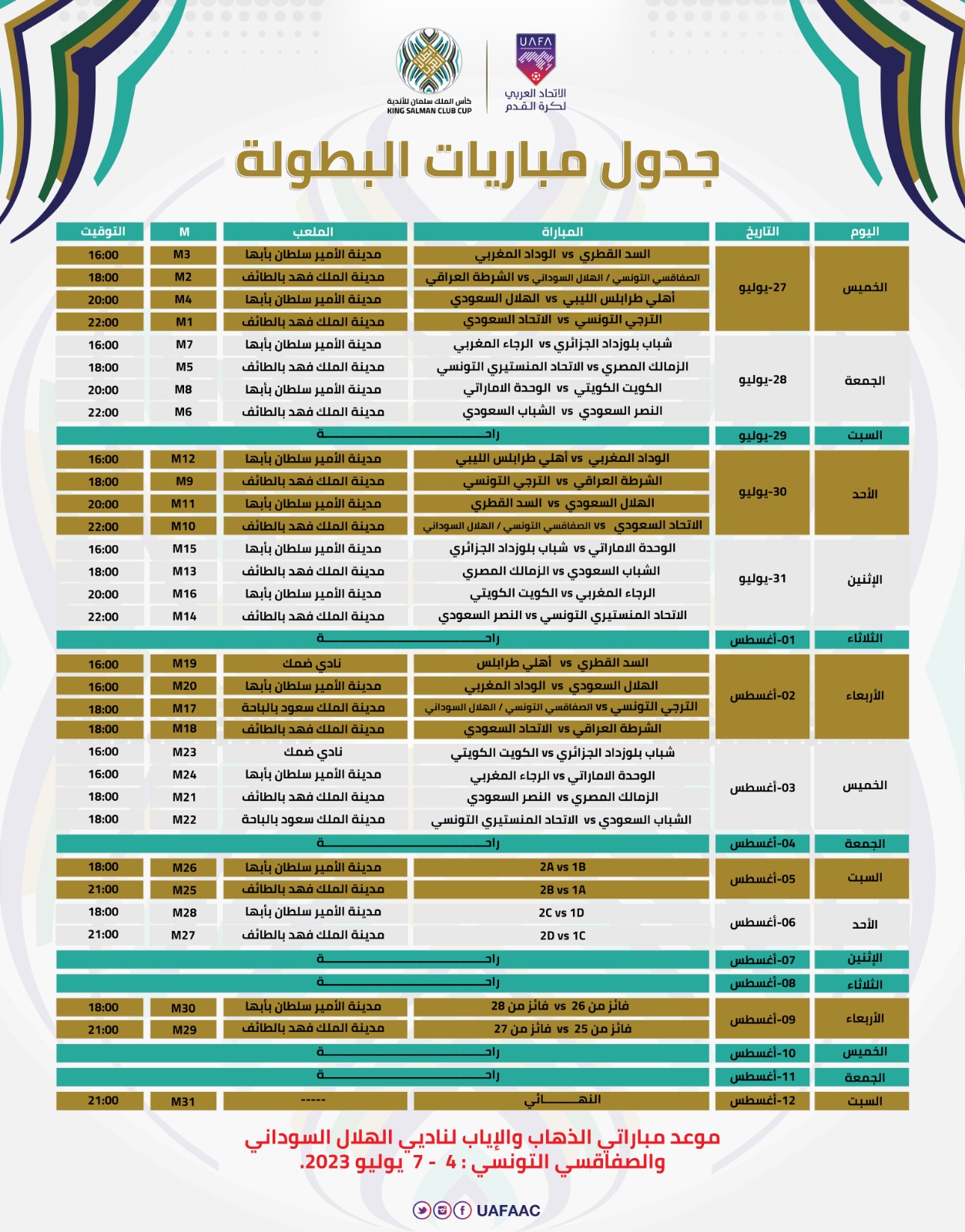 البطولة العربية، يلتقي اليوم الجمعة، الصفاقسي التونسي بقيادة المدرب المصري حسام البدري مع الهلال السوداني، في إياب الدور الثاني من تصفيات بطولة كأس الملك سلمان للأندية 2023، لحسم هوية المتأهل منهما إلى دور المجموعات، المقرر إقامته خلال الفترة من 27 يوليو الحالي إلى 12 أغسطس المقبل في المملكة العربية السعودية.