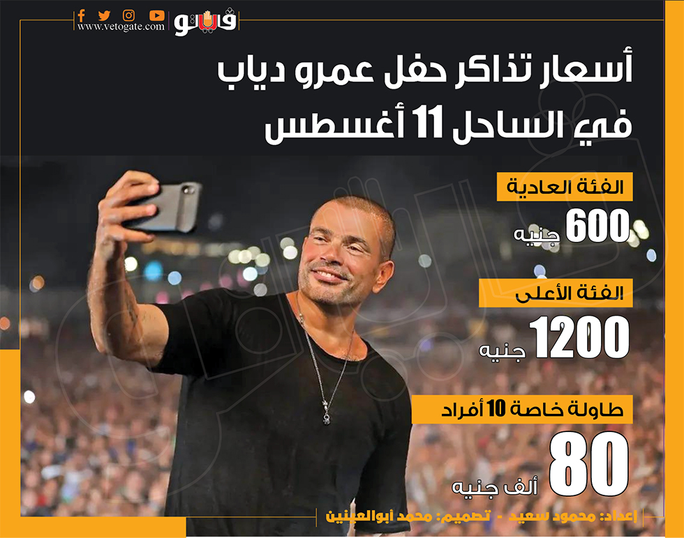 أسعار تذاكر حفل عمرو دياب في الساحل 11 أغسطس (إنفوجراف) الجمعة 07/يوليو/2023 - 03:29 م 7/7/2023 3:29:22 PM عمرو دياب، فيتو محمود سعيد شارك طباعة 18 حجم الخط شارك طباعة عمرو دياب حفل عمرو دياب اسعار تذاكر حفل عمرو دياب أغاني عمرو دياب حفلات عمرو دياب
