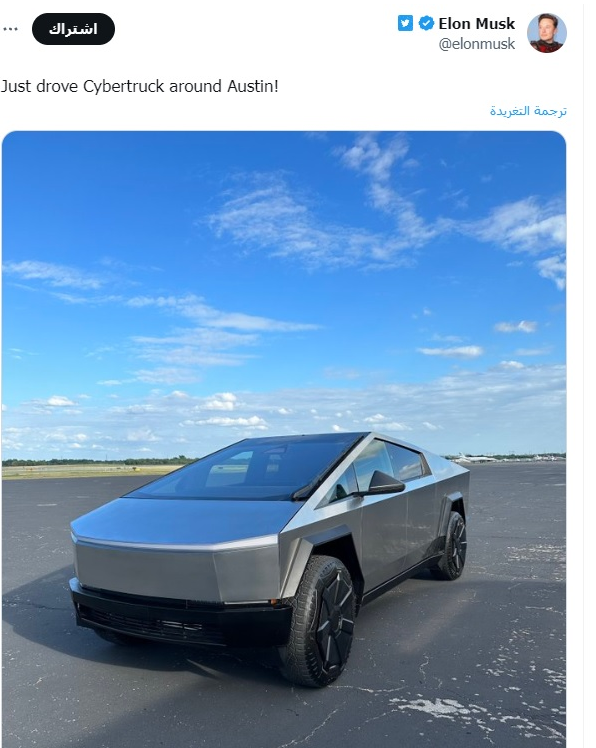 ونشر إيلون ماسك، صورة للشاحنة الإلكترونية Cybertruck، عبر حسابه الرسمي على موقع تويتر، وكتب يقول: «فقط قدت Cybertruck حول أوستن».