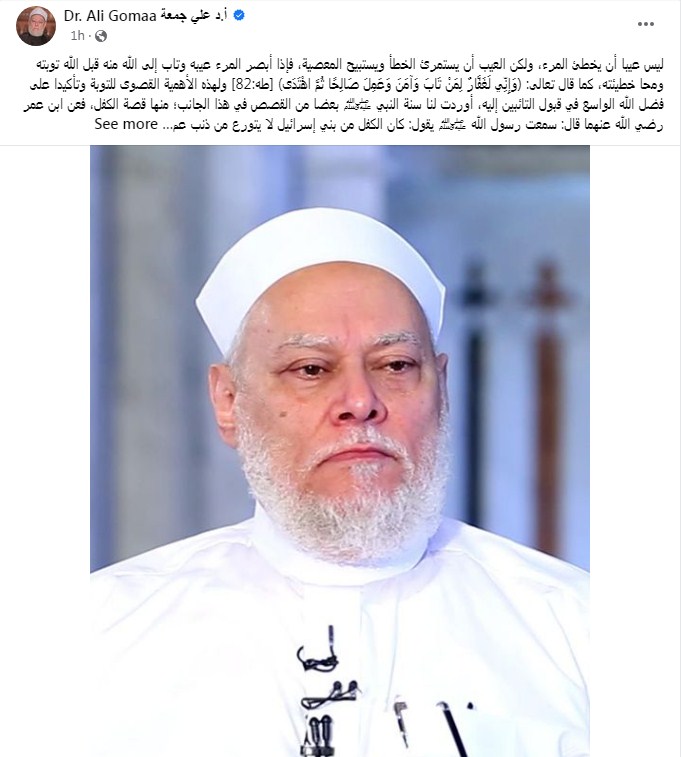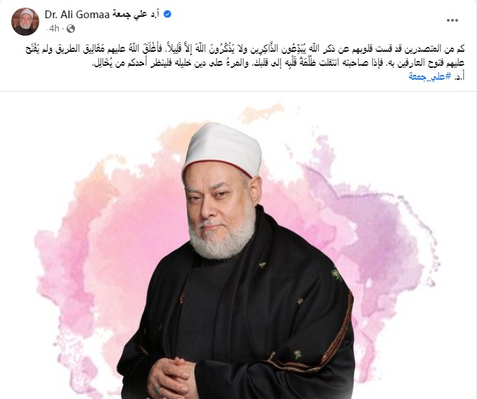وكتب الدكتور علي جمعة عن التوبة عن المعصية، عبر تدوينة له بالفيس بوك "كم من المتصدرين قد قست قلوبهم عن ذكر الله يُبَدِّعُون الذَّاكِرِين ولا يَذْكُرُونَ اللّهَ إِلاَّ قَلِيلًا. فأغْلَقَ اللهُ عليهم مَغَالِيق الطريق ولم يَفْتَح عليهم فتوح العارفين به. فإذا صاحبته انتقلت ظُلْمَةُ قَلْبِه إلى قلبك. والمرءُ على دين خليله فلينظر أحدكم من يُخَالِل."