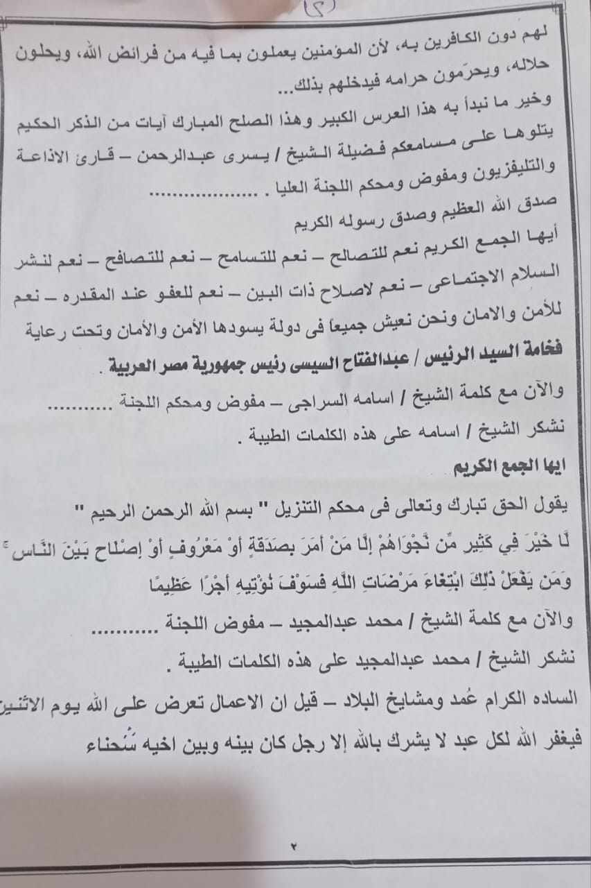 وقال اللواء عصام العمدة عضو مجلس النواب فى تصريحات إن السعي فى القضاء على الخصومات الثأريه يهدف للتخفيف عن رجال الشرطة وحقن الدماء بين العائلات فى الصعيد وهو جهد يلقى قبولا حسنا من كافة مؤسسات الدولة ورجال العائلات.