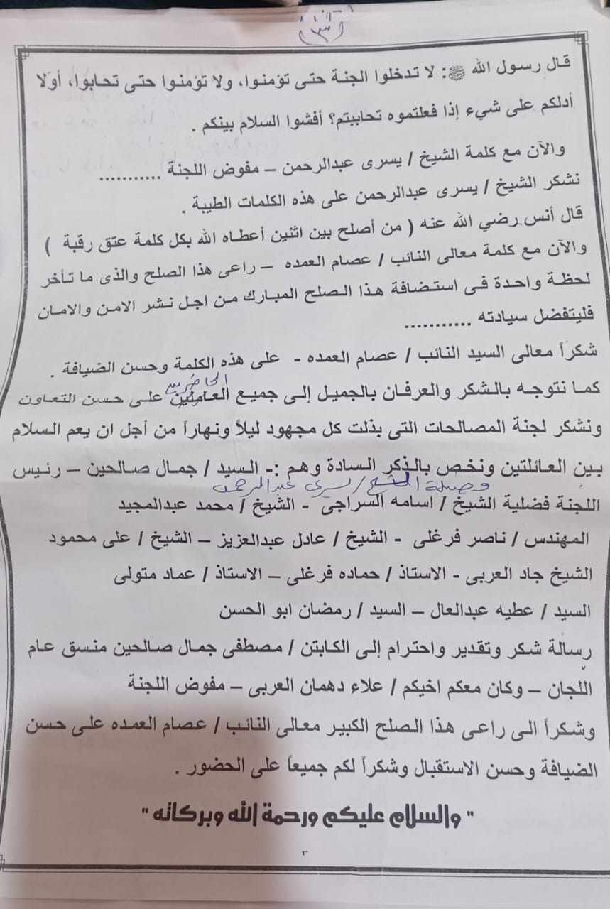 حيث تمكنت لجنة المصالحات العرفية برعاية عضو مجلس النواب اللواء عصام العمدة بإنهاء الخصومة الثأرية بين عائلتي أل دياب وأل دهمان بمركز ساحل سليم بمحافظة أسيوط