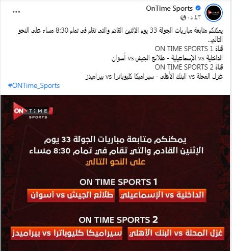وكتبت قناة أون تايم سبورتس عبر صفحتها الرسمية علي موقع التواصل الاجتماعي فيس بوك:" يمكنكم متابعة مباريات الجولة 33 يوم الإثنين القادم والتي تقام في تمام 8:30 مساء على النحو التالي..