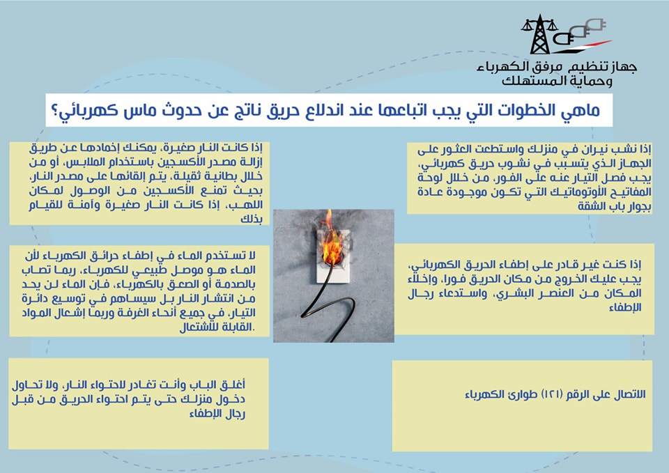 أعلنت الصفحة الرسمية لجهاز مرفق الكهرباء وحماية المستهلك عن الخطوات التي يجب اتباعها عند اندلاع حريق ناتج عن حدوث ماس كهربائي في المنزل.