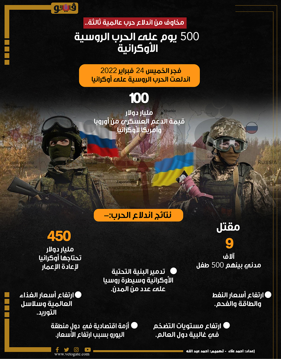 مخاوف من اندلاع حرب عالمية ثالثة.. 500 يوم على الحرب الروسية الأوكرانية (انفوجراف) الأحد 09/يوليو/2023 - 02:53 م 7/9/2023 2:53:09 PM الحرب الروسية الأوكرانية، فيتو احمد علاء شارك طباعة 18 حجم الخط شارك طباعة الحرب الروسية الأوكرانية 500 يوم علي الحرب الروسية الأوكرانية روسيا أوكرانيا اسعار النفط