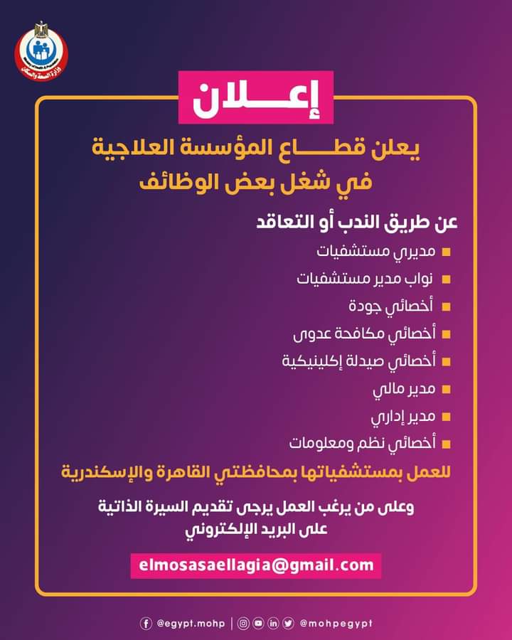 أعلن قطاع المؤسسة العلاجية بوزارة الصحة عن حاجته لشغل بعض الوظائف عن طريق الندب أو التعاقد ومنها: