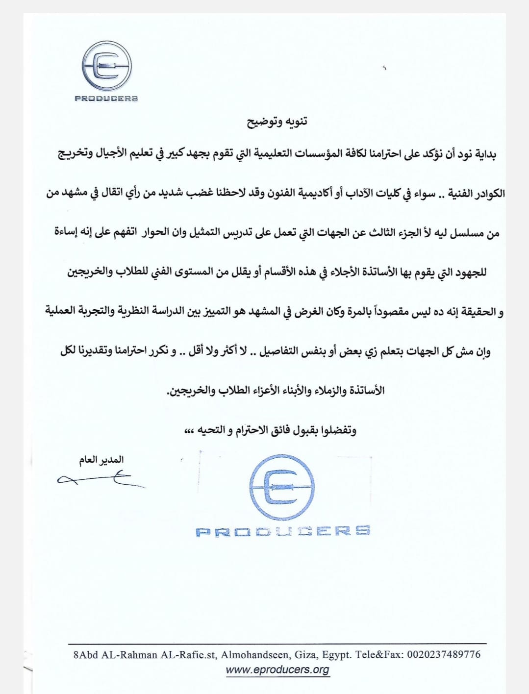 جاء بيان الشركة المنتجة للمسلسل ردا على بيان نقابة المهن التمثيلية، والذي طالب صناع المسلسل بحذف مشهد أساء لأقسام المسرح بحسب ما وصفه بيان النقابة.. وجاء البيان كالتالي:
