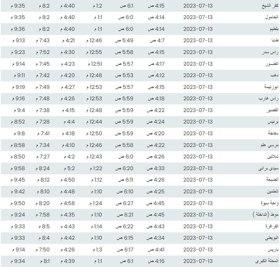 مواقيت الصلاة اليوم وفقًا للتوقيت المحلي لمدينتي القاهرة والإسكندرية وكذلك،مواقيت الصلاة، لعدد من مدن ومحافظات الجمهورية من واقع بيانات الهيئة العامة للمساحة