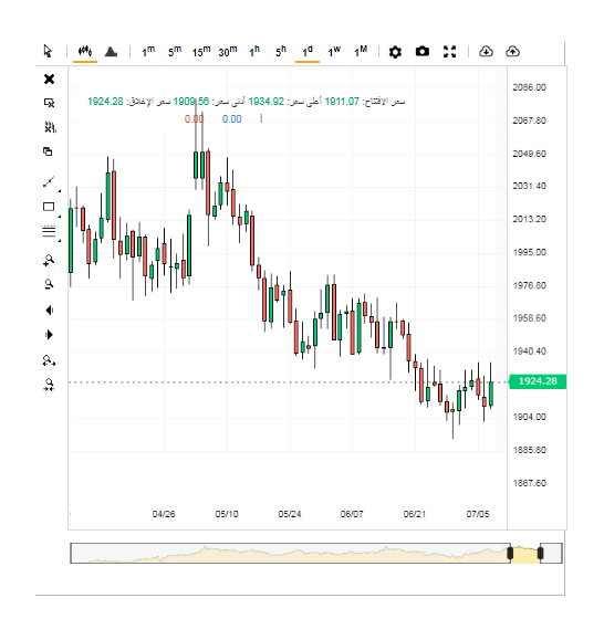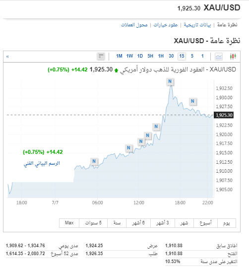 شهدت مؤشرات أسعار الذهب تحركات صاعدة طفيفة عالميا لترتفع بنسبة 0.75 %، عند 1925.30 دولار للأونصة، كما نجحت محاولات مؤشر الذهب خلال هذا الأسبوع في اختراق منطقة المقاومة، حيث استطاع اختراق النقطة 1927 وعاد للهبوط والاغلاق عند 1925.30 مثبتا لنقاط الدعم عند 1925 – 1935 دولار للأونصة.