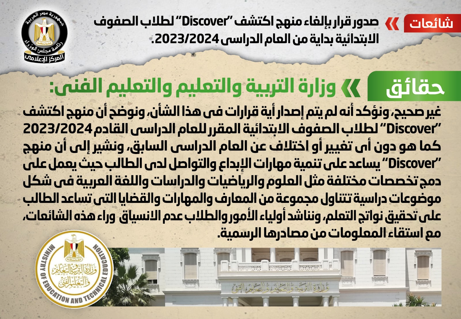 انتشر في بعض المواقع الإلكترونية وصفحات التواصل الاجتماعي أنباء بشأن صدور قرار بإلغاء منهج اكتشف "Discover" لطلاب الصفوف الابتدائية بداية من العام الدراسي 2023/2024.