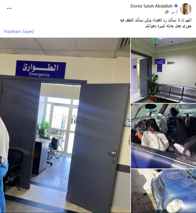ونشرت ابنة الفنان صلاح عبد الله صورًا من الحادث، وعلقت قائلة: "اللهم إنا لا نسألك رد القضاء ولكن نسألك اللطف فيه جوزي عمل حادثة كبيرة دعواتكم".