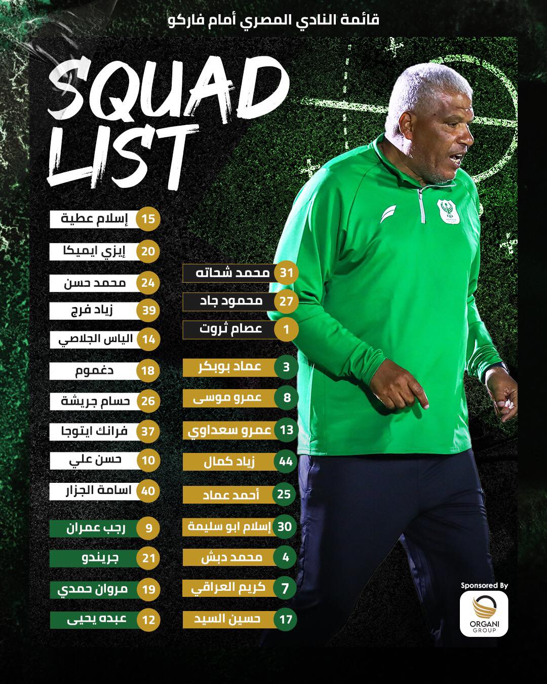 أعلن ميمي عبدالرازق المدير الفني للنادي المصري عن تشكيل فريقه لمواجهة فاركو المباراة التي تقام الجولة الـ 33 لمسابقة الدوري المصري وتقام على استاد برج العرب في تمام الثامنة والنصف مساء.