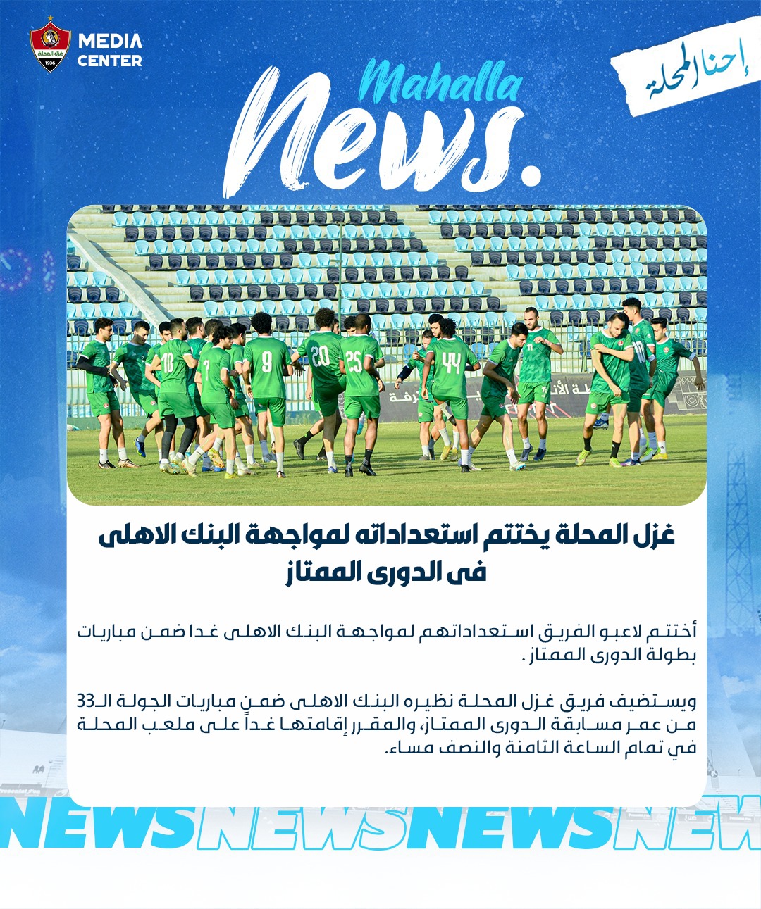 اختتم لاعبو غزل المحلة استعداداتهم لمواجهة البنك الأهلي غدا الاثنين ضمن مباريات بطولة الدوري وستقام في الجولة الثالثة والثلاثين من عمر مسابقة الدوري المصري الممتاز، ويستضيفها استاد غزل المحلة في تمام الثامنة والنصف مساء.