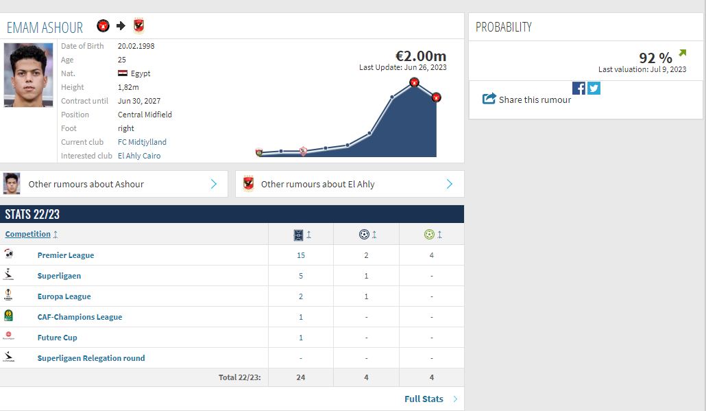 كشف الموقع العالمي الشهير ترانسفير ماركت المتخصص بسوق انتقالات اللاعبين عن اقتراب إتمام صفقة انتقال إمام عاشور لاعب وسط منتخب مصر وميتلاند الدنماركي إلي النادي الأهلي في الصيف الحالي.