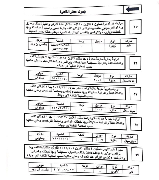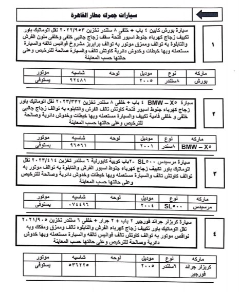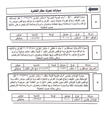 تفاصيل جلسة مزاد 11 يوليو 2023 للسيارات المخزنة بساحة جمارك مطار القاهرة