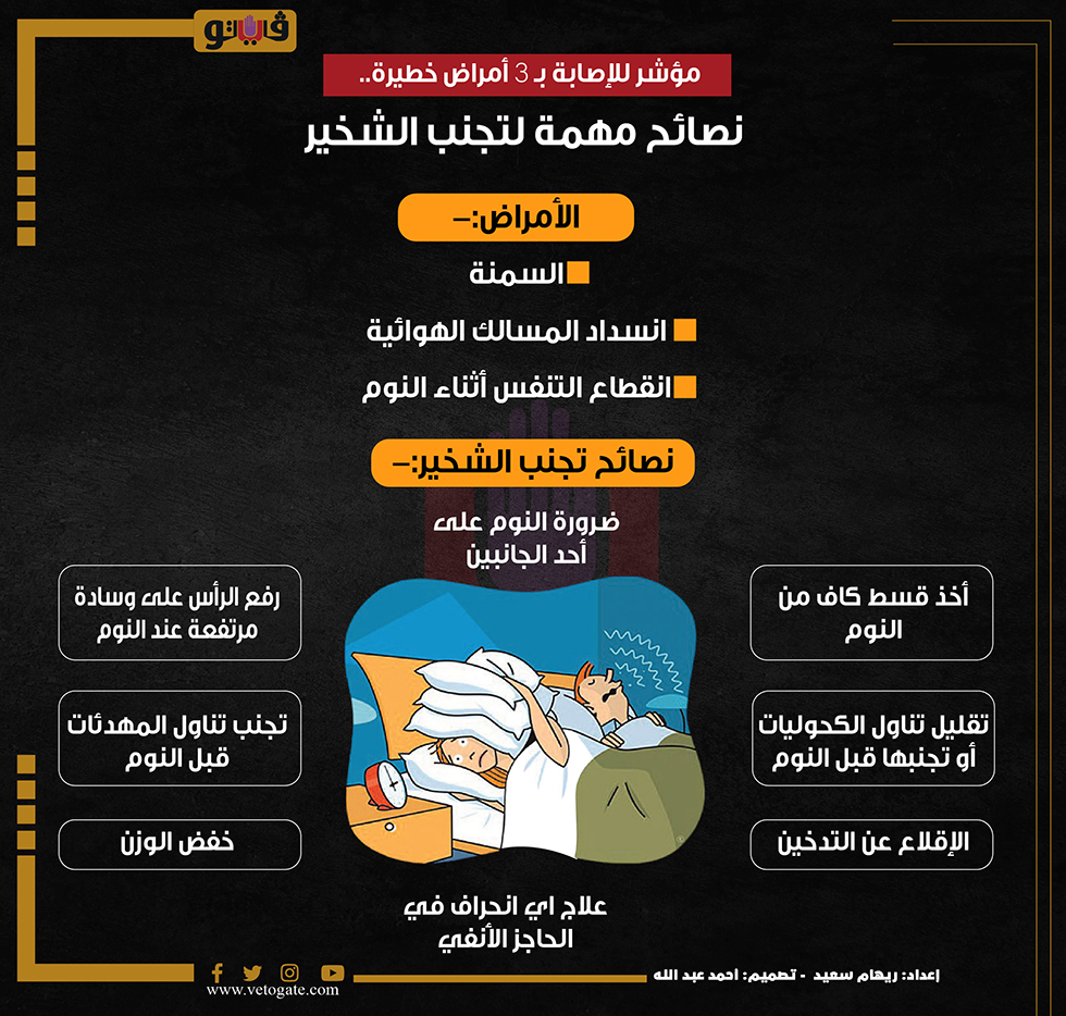 مؤشر للإصابة بـ 3 أمراض خطيرة.. نصائح مهمة لتجنب الشخير (إنفوجراف) الإثنين 10/يوليو/2023 - 03:46 م 7/10/2023 3:46:57 PM خطورة الشخير أثناء النوم،فيتو ريهام سعيد شارك طباعة 18 حجم الخط شارك طباعة إنقطاع التنفس أثناء النوم الإقلاع عن التدخين انقطاع التنفس تدفق الهواء خفض الوزن