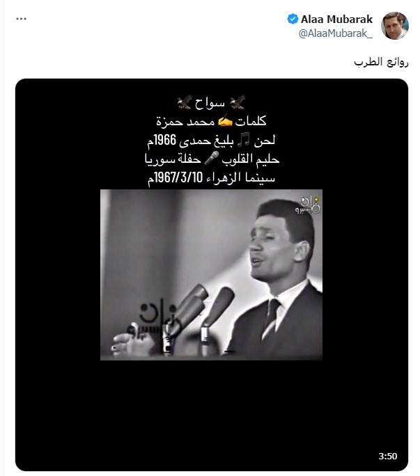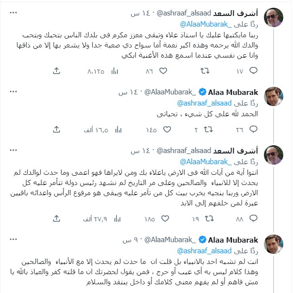 كما علق أشرف السعد على تفاعل علاء مبارك قائلًا: "انتوا آية من آيات الله فى الأرض يا علاء بك ومن لا يراها فهو أعمى وما حدث لوالدك لم يحدث إلا للأنبياء والصالحين"