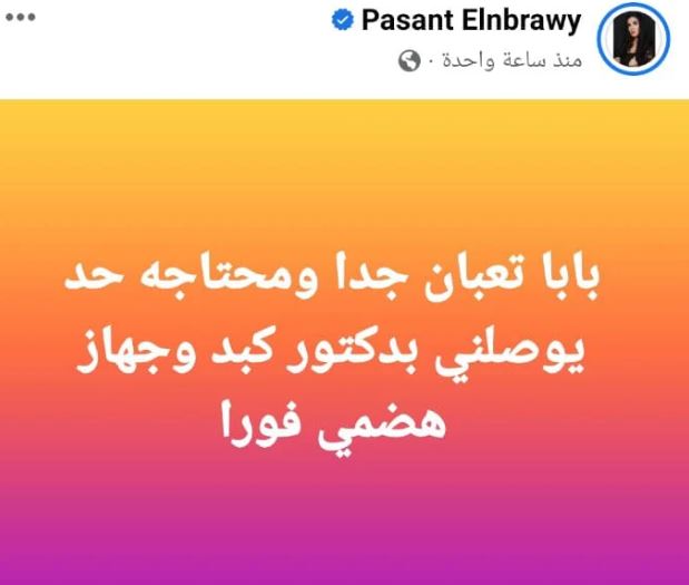وكتبت بسنت النبراوي قائلة: "بابا تعبان جدًا، محتاجة حد يوصلني بدكتور كبد وجهاز هضمي فورًا".