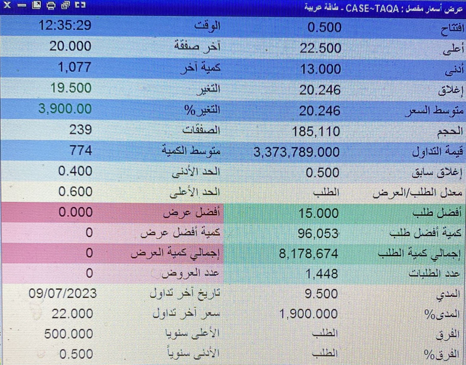 بناءً على قرار رئيس مجلس إدارة البورصة المصرية تقرر إلغاء اليوم أيضا عمليات منفذة بالسوق الرئيسي على الورقة المالية طاقة عربية خلال جلسة تداول اليوم 10/07/2023 وعدم الأخذ بأثر مجموعة من عمليات اليوم المنفذة على أسهم شركة طاقة عربية خلال الجلسة والأخذ بالاعتبار على سعر الإقفال اللحظي عند 20.09 جنيه.