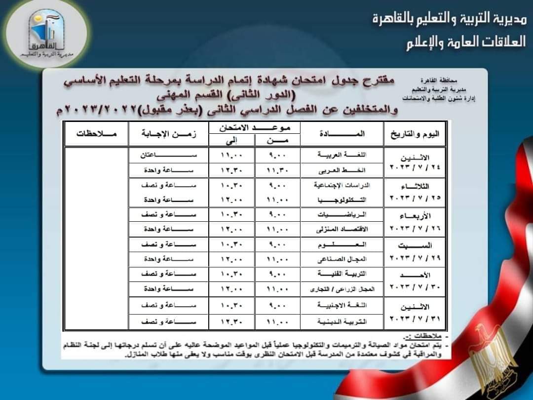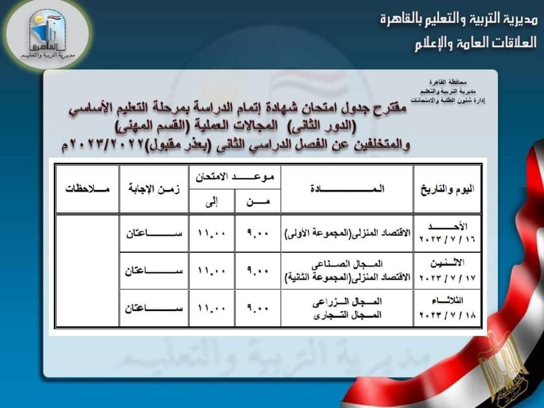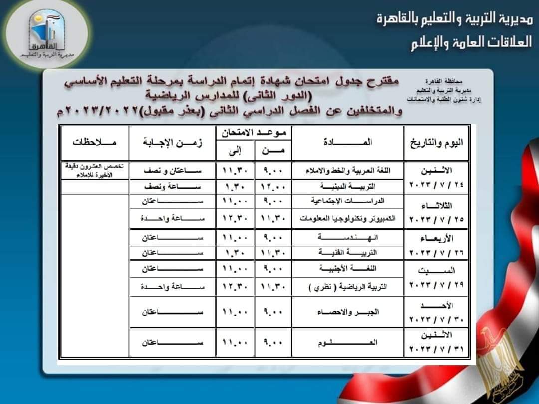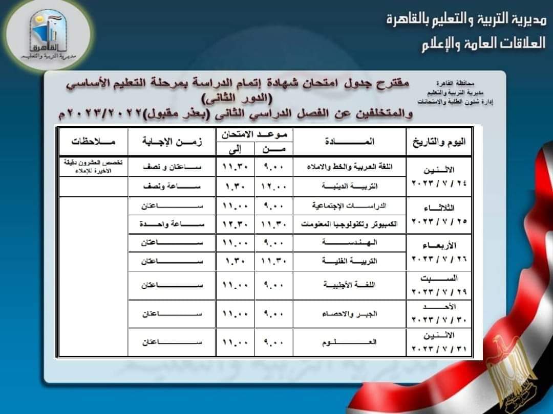 وننشر فيما يأتي جداول امتحانات شهادة إتمام الدراسة بمرحلة التعليم الأساسي للدور الثاني والمتخلفين عن امتحانات الفصل الدراسي الثاني بعذر مقبول: