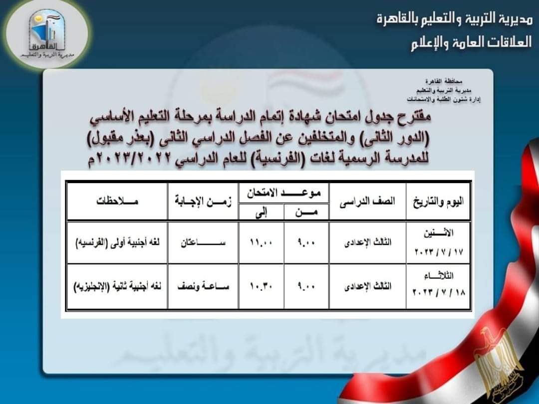 جدول امتحانات الدور الثاني للشهادة الإعدادية بالقاهرة 2023