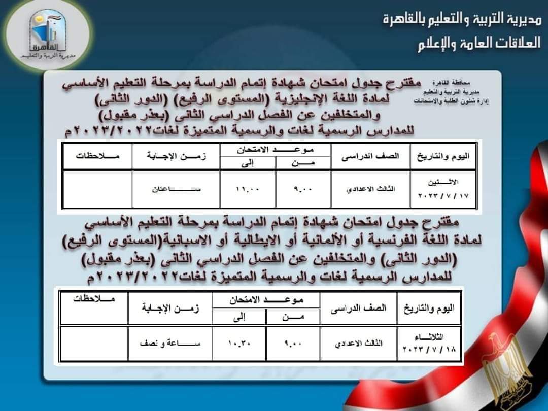 وأكدت تعليم القاهرة أنه يتم امتحان المستوى الرفيع للصف الثالث الإعدادي يومي الاثنين الموافق 17 يوليو 2023، والثلاثاء الموافق 18 يوليو 2023.