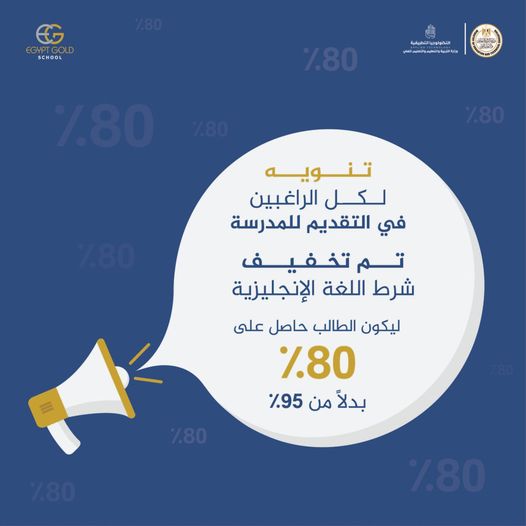 ونبهت مدرسة إيجيبت جولد للذهب Egypt Gold School على جميع طلاب الشهادة الإعدادية 2023 الراغبين في التقديم للعام الدراسي الجديد 2024، بأنه في إطار حرص المدرسة على التخفيف فقد تم تعديل شرط اللغة الإنجليزية للقبول بالمدرسة ليكون الطالب حاصلا على 80% بدلًا من 95%، موضحة بأنه سيتم الإعلان عن ميعاد التقديم قريبًا.