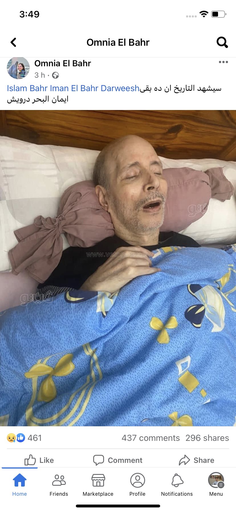 وعلقت ابنة الفنان إيمان البحر درويش، على الصورة التي نشرتها على حسابها بموقع التواصل الاجتماعي فيس بوك، وتداولها العديد من رواد مواقع التواصل الاجتماعي تدهور الحالة الصحية للفنان: "سيشهد التاريخ، إن دا بقى الفنان إيمان البحر درويش".