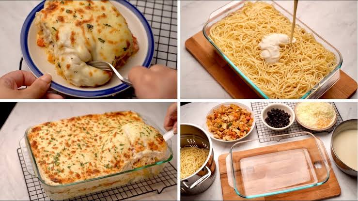 في صينية فرن نوزع نصف كمية المكرونة، ثم نوزع عليها كمية الفراخ، وثم نوزع بقية كمية المكرونة.
