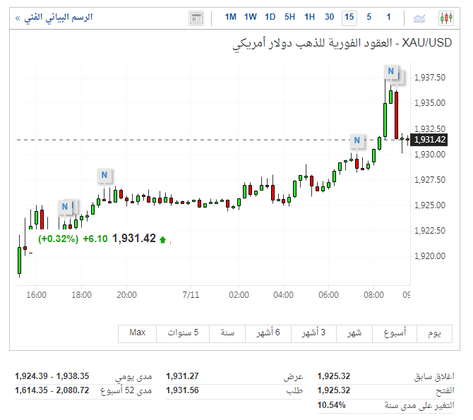 تشهد أسعار الذهب تغيرات طفيفة مع بداية تداولات اليوم في البورصة العالمية بعد أن تسببت بيانات الوظائف الأمريكية خلال الأسبوع الماضي في شكوك بشأن قوة سوق العمل الأمريكي وبالتالي مسار أسعار الفائدة القادم، كما استقر سعر الذهب عند المستوى 1931.66 دولار للأونصة ليشهد تغيرات طفيفة حول هذا المستوى، كما سجل انخفاض طفيف اليوم بنسبة 0.33 %، ليسجل عيار 24 حوالى 2476.63 جنيها للجرام الواحد فى مصر.