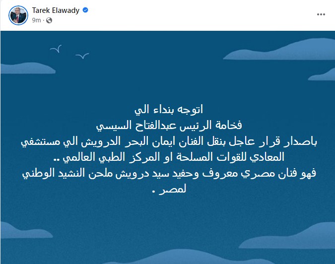 وكتب طارق العوضي في النداء الذي وجهه للرئيس السيسى لعلاج إيمان البحر درويش: "اتوجه بنداء إلى فخامة الرئيس عبدالفتاح السيسي باصدار قرار عاجل بنقل الفنان إيمان البحر الدرويش إلى مستشفي المعادي للقوات المسلحة أو المركز الطبي العالمي..".