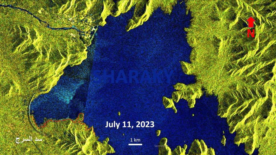 وقال “شراقي”: "التخزين الرابع يبدأ الجمعة القادم لمدة شهرين حيث تظهر الأقمار الصناعية اقتراب بحيرة سد النهضة رويدًا رويدًا من مستوى التخزين الثالث الذي توقف في 11 أغسطس 2022 عند منسوب 600 متر فوق سطح البحر بإجمالي تخزين 17 مليار متر مكعب، باقٍ حوالي 3 أيام (الجمعة 14 يوليو 2023) للوصول إلى منسوب 600 متر (عند الخط الأحمر في الصورة).