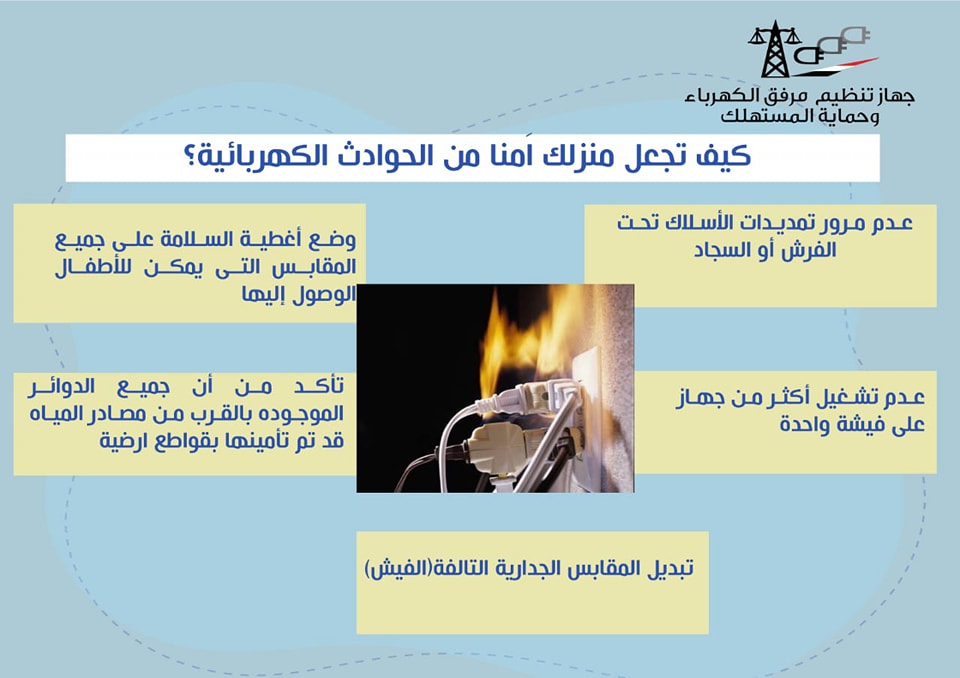 حددت الصفحة الرسمية لجهاز مرفق الكهرباء وحماية المستهلك بعض الخطوات البسيطة التي يمكن من خلالها الحفاظ على سلامة وآمان المنزل من الحوادث الكهربائية.