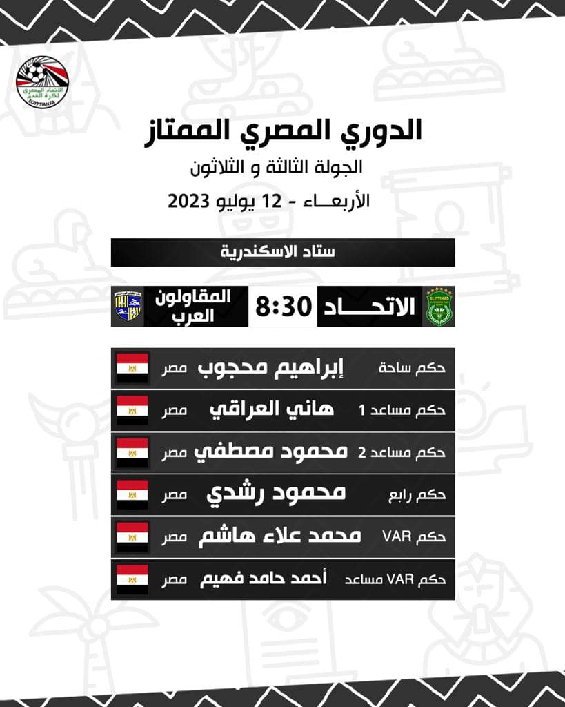 ويدير لقاء الاتحاد السكندري والمقاولون طاقم حكام مكون من، إبراهيم محجوب حكما للساحة ويساعده هاني العراقي ومحمود مصطفي، ومحمود رشدي حكما رابعا، ومحمد علاء هاشم حكما للفار وأحمد حامد فهيم حكما مساعدا للفار.