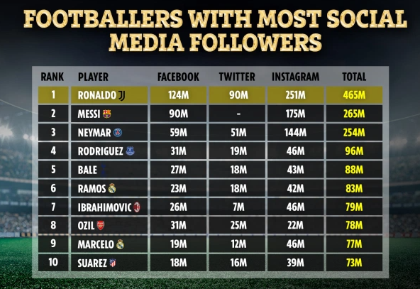 1- كريستيانو رونالدو - 456 مليون متابع - (124 مليون "فيسبوك" - 90 مليون "تويتر" - 251 مليون "انستجرام")