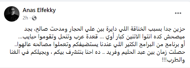 وقال الدكتور أنس الفقي وزير الإعلام الأسبق، على حسابه الشخصي بموقع التواصل الإجتماعي فيسبوك " حزين جدا بسبب الخناقة اللي دايرة بين علي الحجار ومدحت صالح، بجد ميصحش كده انتوا الاتنين كبار أوي … قعدة عرب وتنحل وتقوموا حبايب…أو برنامج من البرامج الكتير اللي عندنا يستضيفكم وتعملوا مصالحه عالهوا.. حصلت زمان بين عبد الحليم وفريد.. ده احنا بنتشرف بيكم، وبجيلكم في الغنا والطرب!!! ".