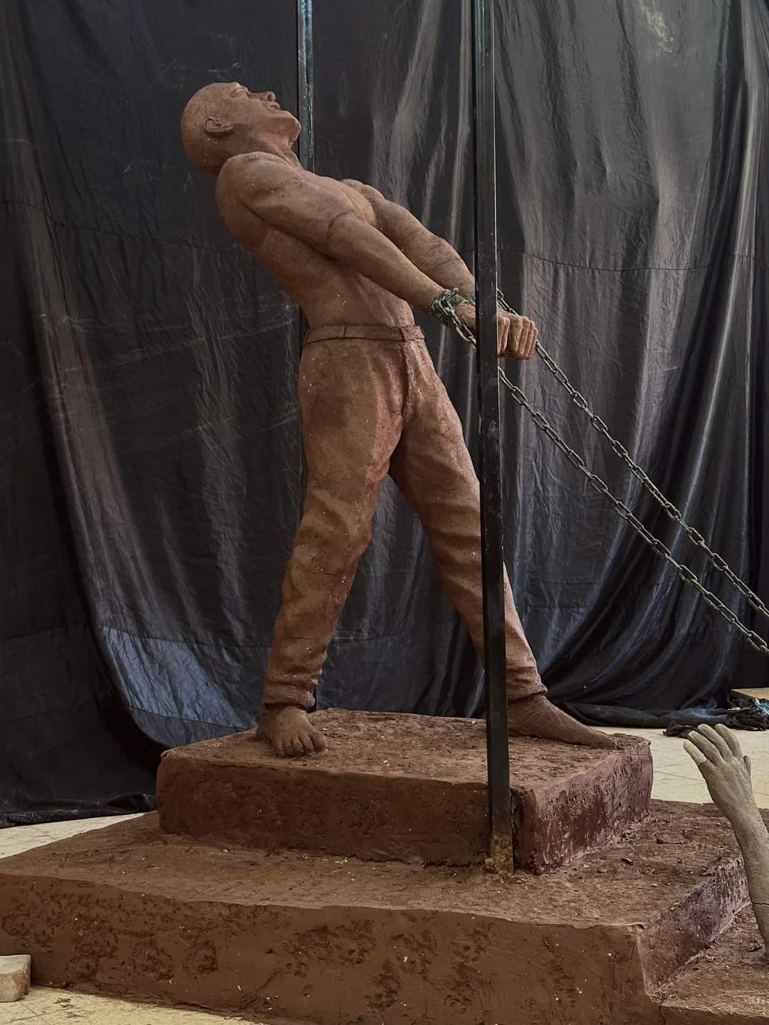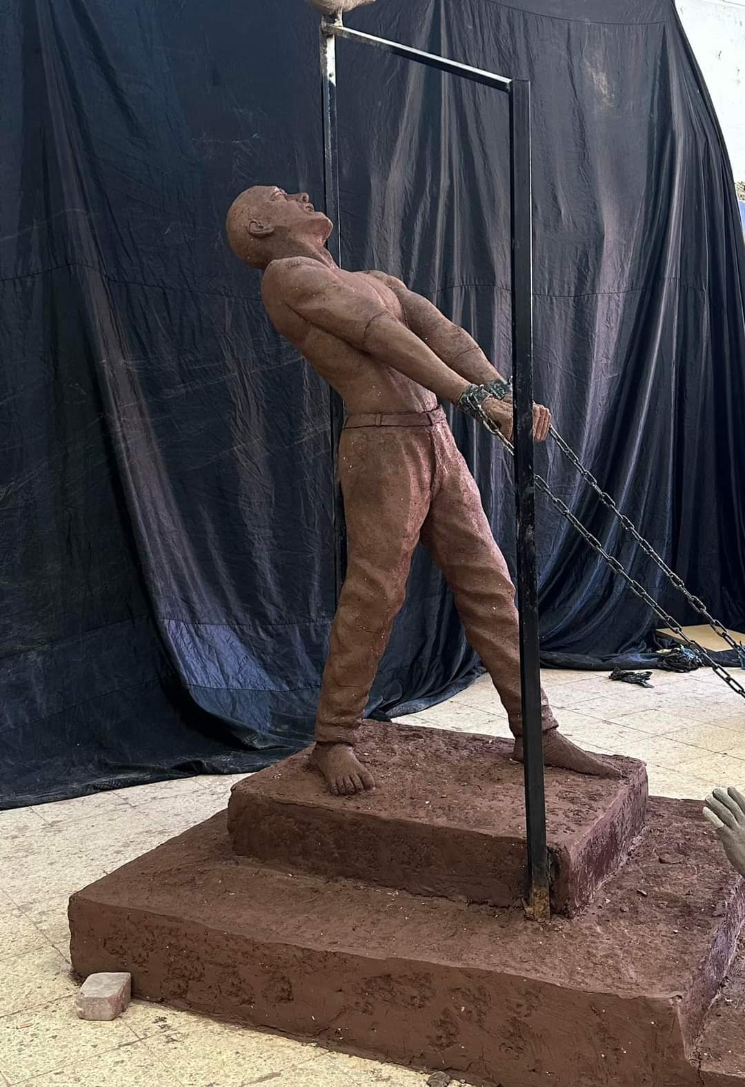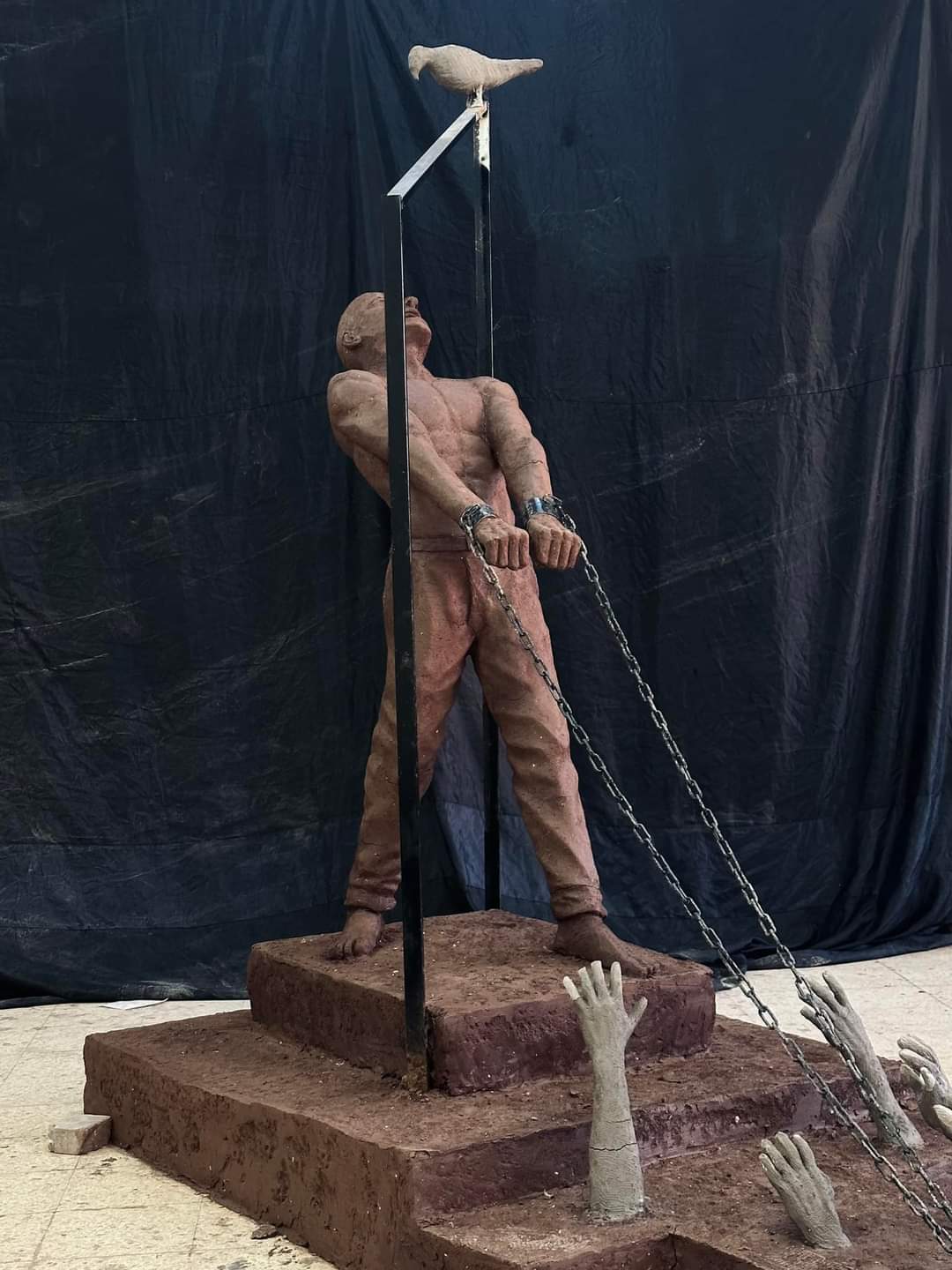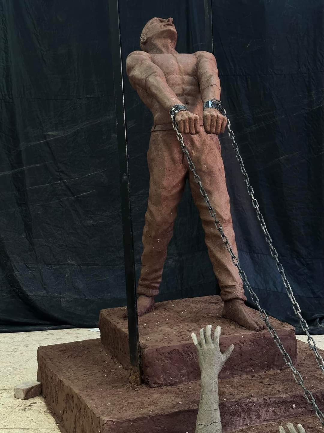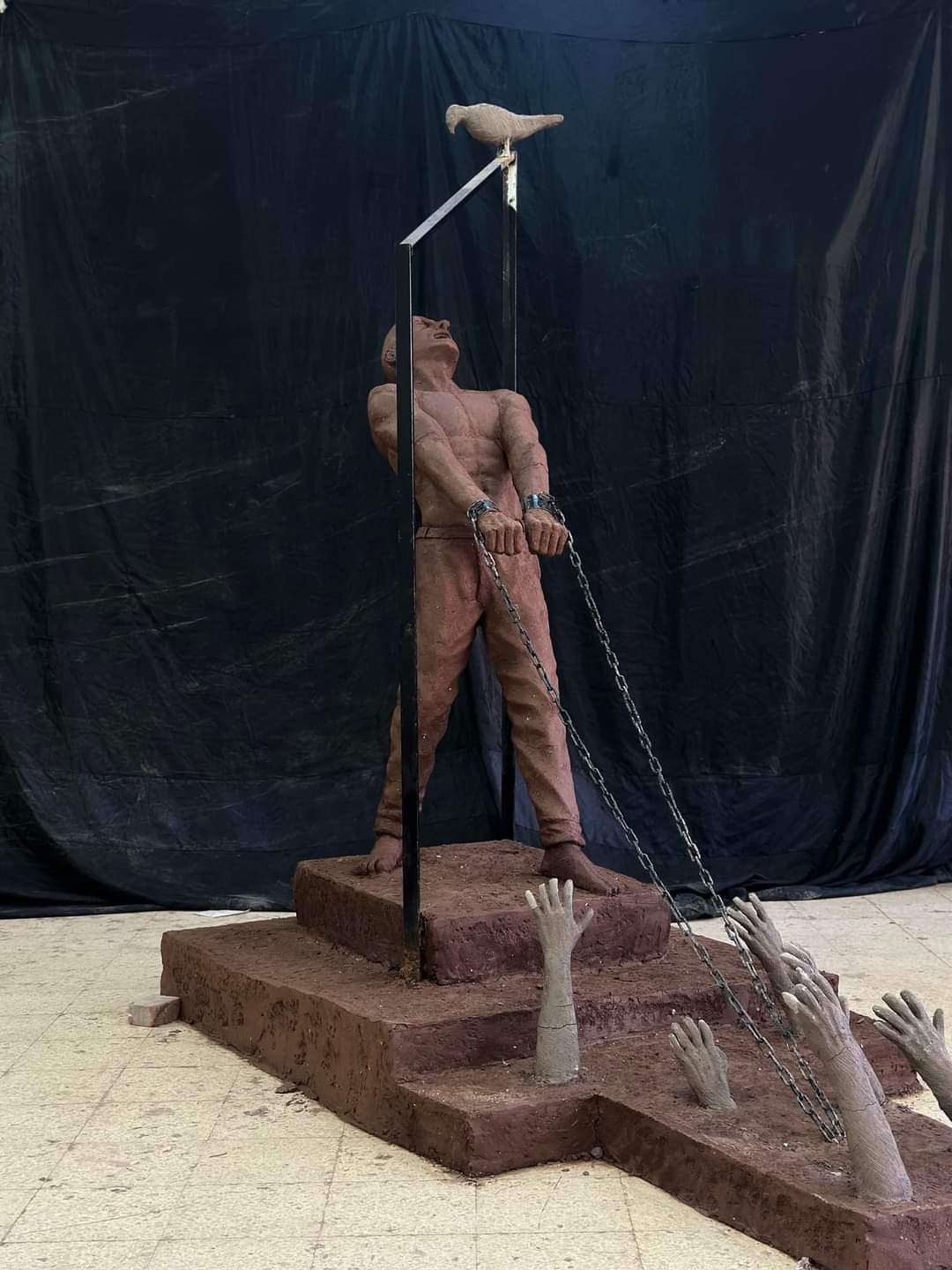 وأضاف ابن محافظة المنيا: إن القيود مش نهاية الإنسان وحاولت أعبر عن هذا في تفاصيل ملامح التمثال وقوه جسده في محاوله لفك القيود والخروج إلى الحريه.