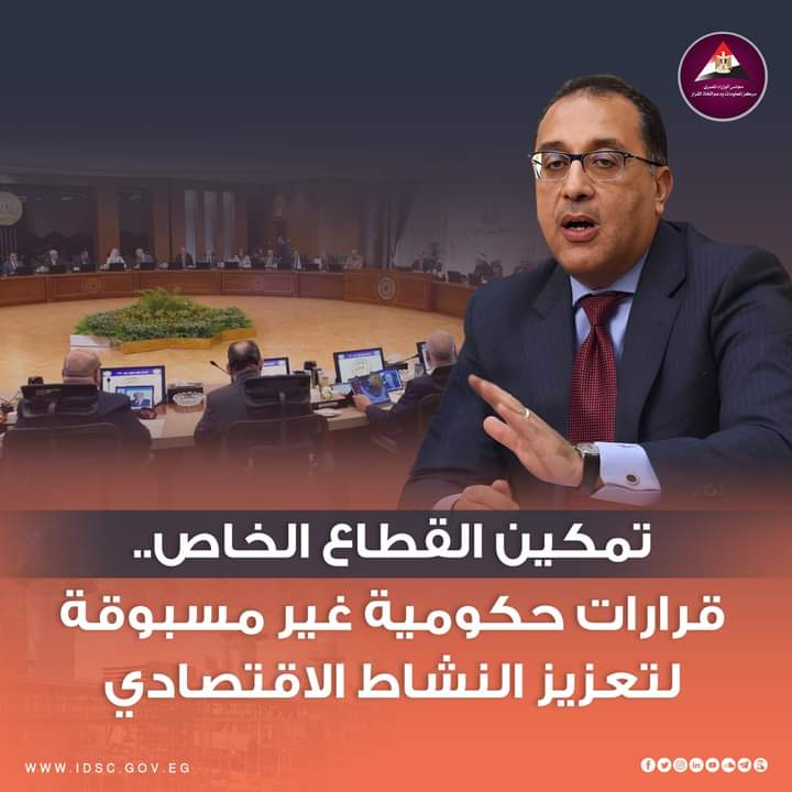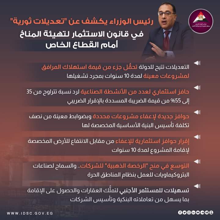 قرارات مجلس الوزراء، نشر مركز المعلومات ودعم اتخاذ القرار بمجلس الوزراء عبر صفحته الرسمية على موقع التواصل الاجتماعي فيسبوك إنفوجراف حول التعديلات الثورية التي قامت بها الحكومة على قانون الاستثمار وأرقام مهمة في السياحة والتصدير وتوفير الدولار حتى عام 2026.
