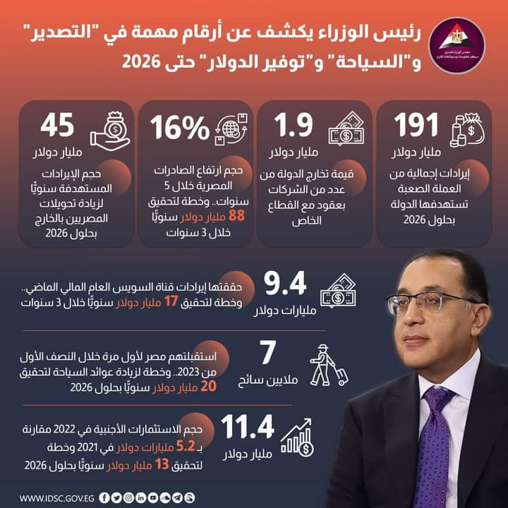 رئيس الوزراء يكشف عن أرقام مهمة في التصدير والسياحة وتوفير الدولار حتى 2026 (إنفوجراف)