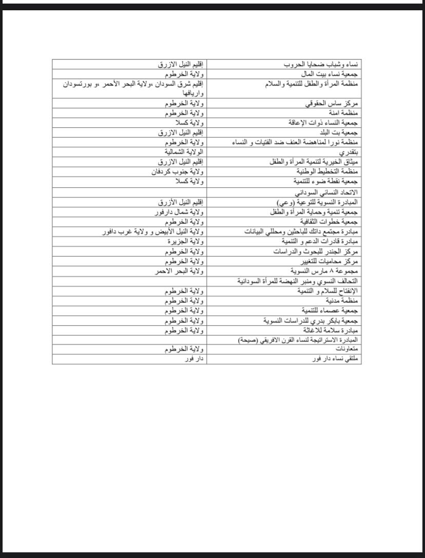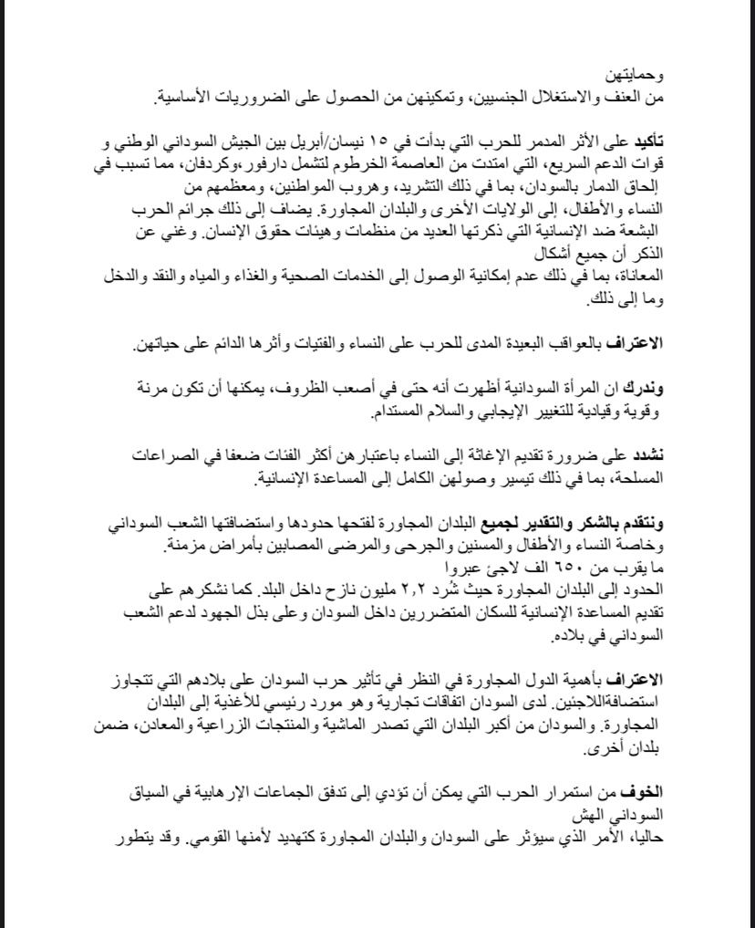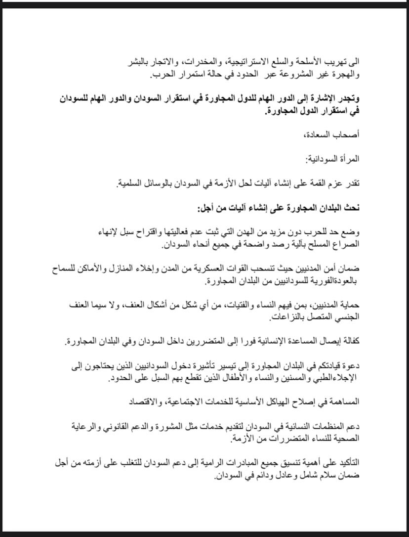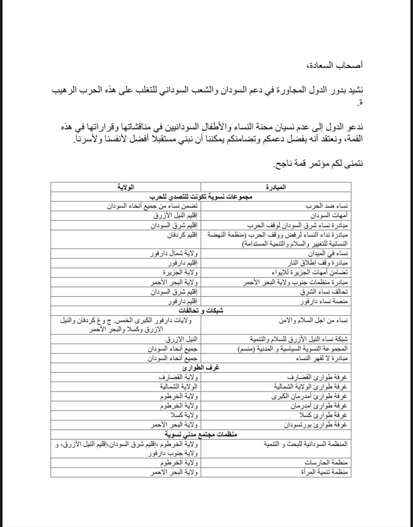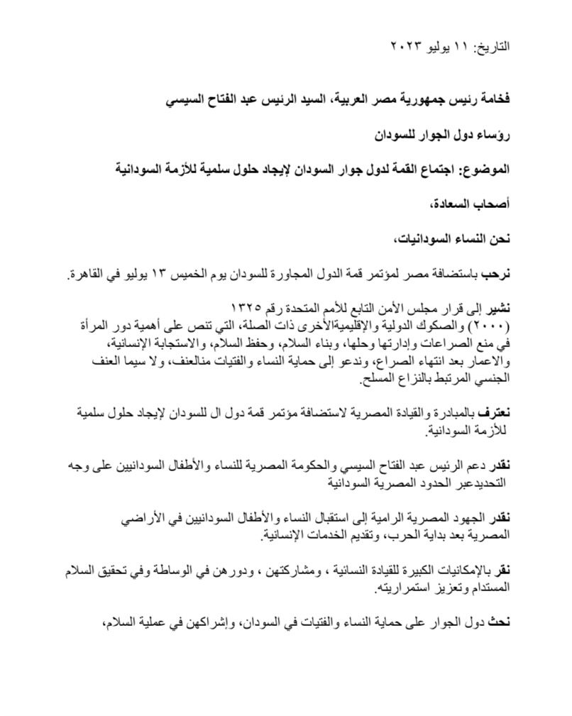 أعربت عدد من المنظمات النسائية السودانية يمثلن 53 منظمة مجتمع مدتى عن تقديرهم للمبادرة المصرية والرئيس السيسي لاستضافة مؤتمر قمة دول جوار السودان لبحث سبل إنهاء الصراع الحالي وتقديرهم لدعم الرئيس السيسي للحكومة السودانية وأطفال ونساء السودان واتخاذ خطوات لحل الأزمة برمتها وحقن دماء الشعب السوداني.