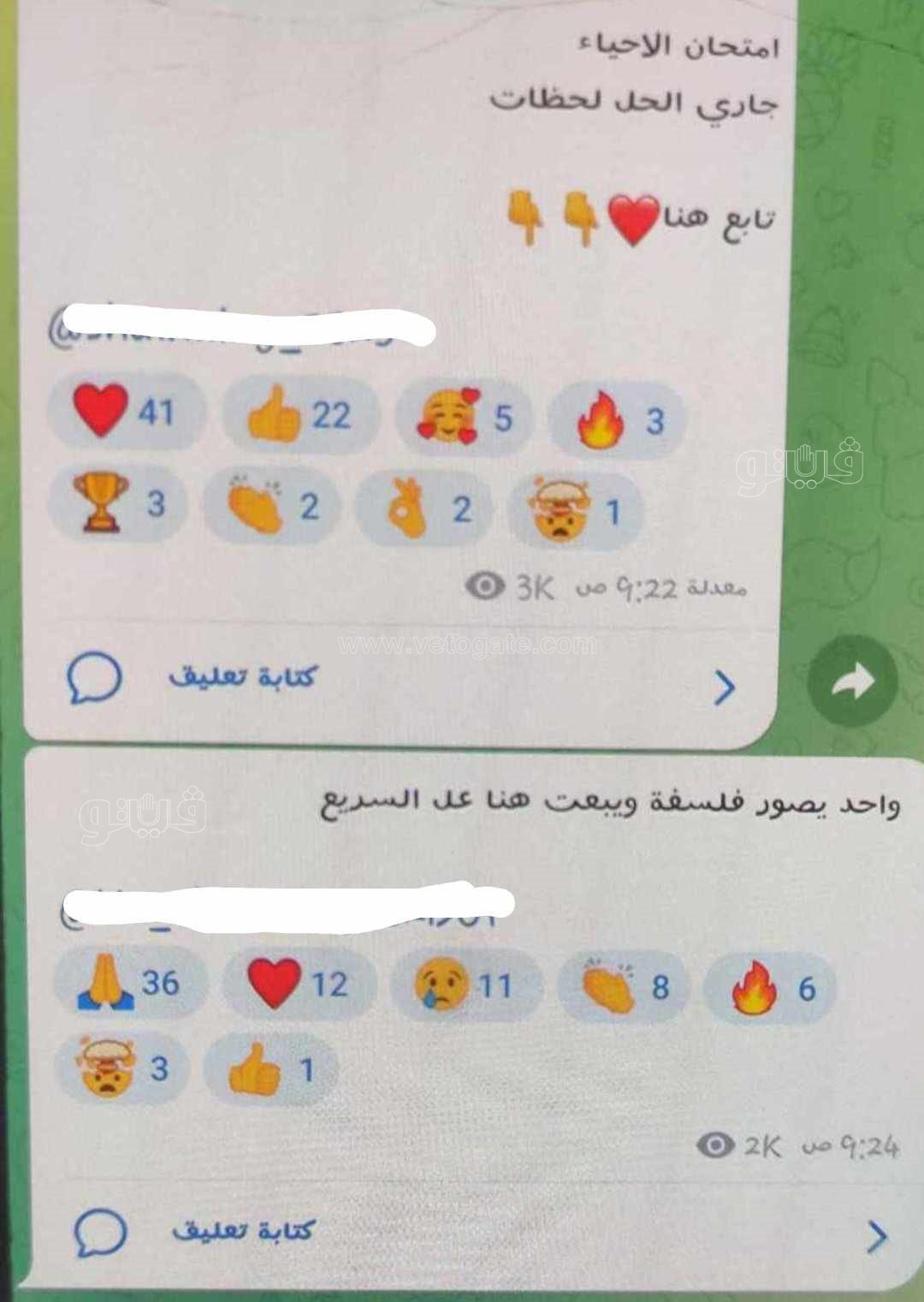 وبدأت جروبات الغش عبر تطبيق تليجرام بنشر أسئلة وإجابات امتحان الأحياء بعد مرور أكثر من ربع ساعة من بدء الامتحان.