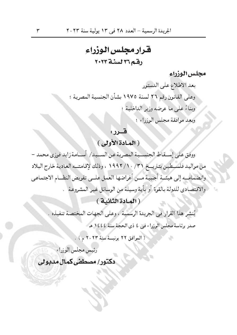 - قرار مجلس الوزراء رقم 36 لسنة 2023، بشأن الموافقة على إسقاط الجنسية المصرية عن أسامة زايد فوزى محمد، من مواليد فلسطين بتاريخ 31/10/1992، وذلك لإقامته العادية خارج البلاد وانضمامه إلى هيئة أجنبية من أغراضها العمل على تقويض النظام الاجتماعى والاقتصادى للدولة بالقوة أو بأية وسيلة من الوسائل غير المشروعة.