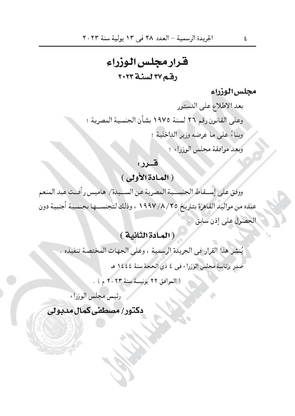 -وقرار مجلس الوزراء رقـم 37 لسنـة 2023، بشأن الموافقة على إسقاط الجنسية المصرية عن هاميس رأفت عبد المنعم عبده، من مواليد القاهرة بتاريخ 25/8/1997، وذلك لتجنسها بجنسية أجنبية دون الحصول على إذن سابق.