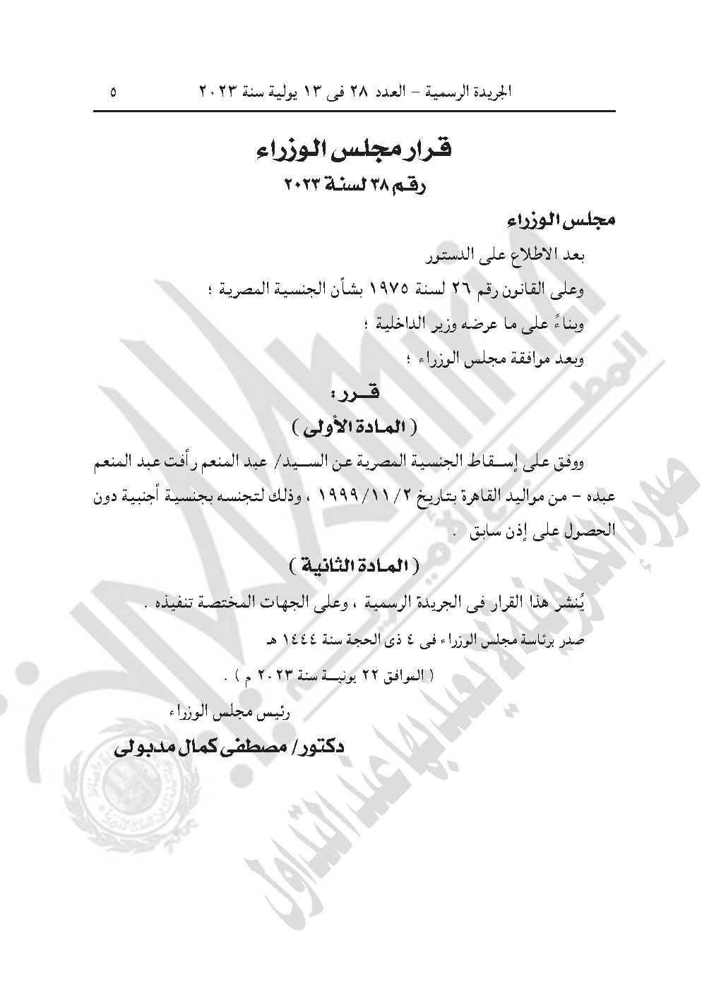 -وقرار مجلس الوزراء رقـم 38 لسنـة 2023، بشأن الموافقة على إسقاط الجنسية المصرية عن عبد المنعم رأفت عبد المنعم عبده، من مواليد القاهرة بتاريخ 2/11/1999، وذلك لتجنسه بجنسية أجنبية دون الحصول على إذن سابق.