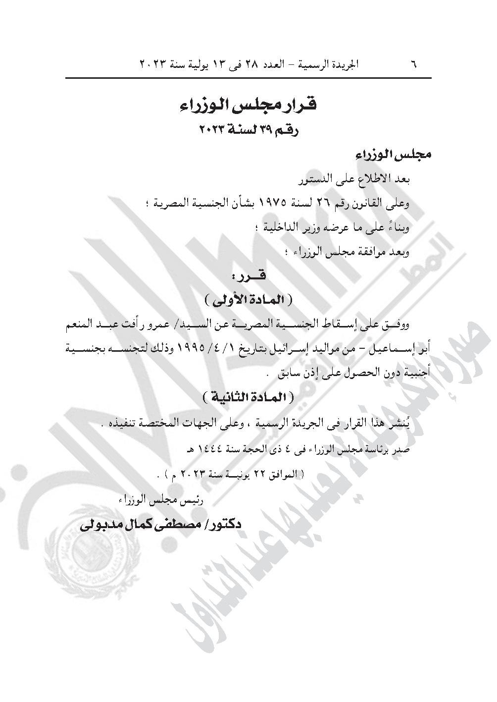 -وقرار مجلس الوزراء رقـم 39 لسنـة 2023، بشأن الموافقة على إسقاط الجنسية المصرية عن عمرو رأفت عبد المنعم أبو إسماعيل، من مواليد إسرائيل بتاريخ 1/4/1995، وذلك لتجنسه بجنسية أجنبية دون الحصول على إذن سابق.
