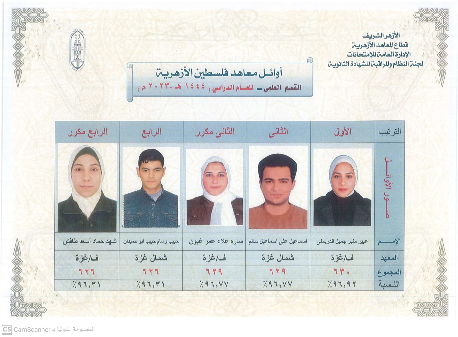 وحصلت على المركز الأول في القسم العلمي عبير منير الدريملي، معهد فتيات غزة، بمجموع 630 بنسبة (96.92٪)، وحصل على المركز الثاني الطالب إسماعيل علي سالم، معهد شمال غزة، بمجموع 629 بنسبة (96.77٪)، وحصلت على المركز الثاني مكرر سارة علاء غبون، معهد فتيات غزة، بمجموع 629 بنسبة (96.77٪)، بينما حصل على المركز الرابع حبيب وسام أبوحميدان، معهد شمال غزة بمجموع 626 بنسبة (96.23%)، كما حصلت على المركز الرابع مكرر شهد حماد طافش، معهد فتيات غزة بمجموع 626 بنسبة (96.23%).