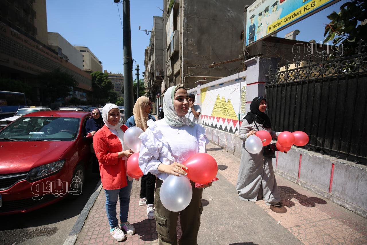 واحتفل طلاب الثانوية العامة بآخر أيام الامتحانات من أمام مدرسة مدرسة قصر الدوبارة بمحافظة القاهرة باللعب بالبلالين وثلج الأفراح.