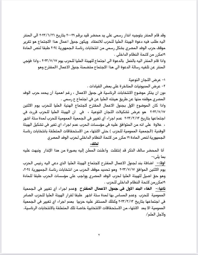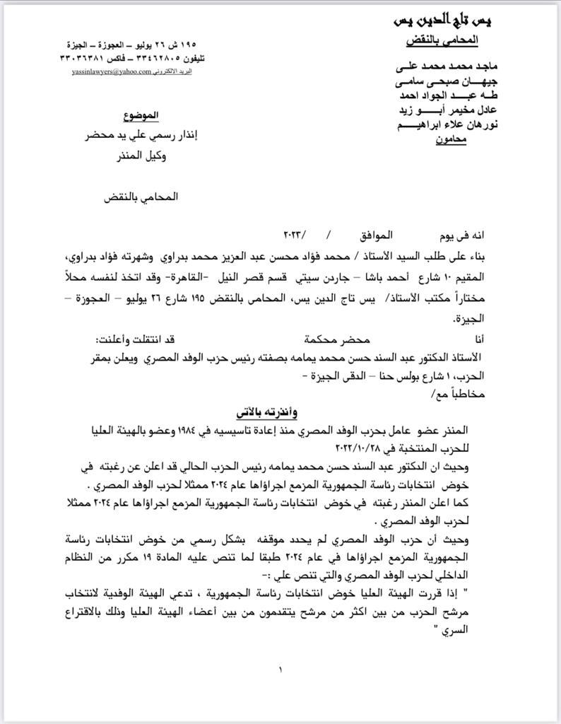 حزب الوفد، أرسل المرشح الرئاسي المحتمل وعضو الهيئة العليا لحزب الوفد فؤاد بدراوي إنذارًا رسميًا جديدًا رقم ٢١٠٦٧ بتاريخ ١٢ /٢٠٢٣/٧ على يد مُحضر لرئيس حزب الوفد عبد السند يمامة منافسه على تمثيل الوفد في انتخابات رئاسة الجمهورية.