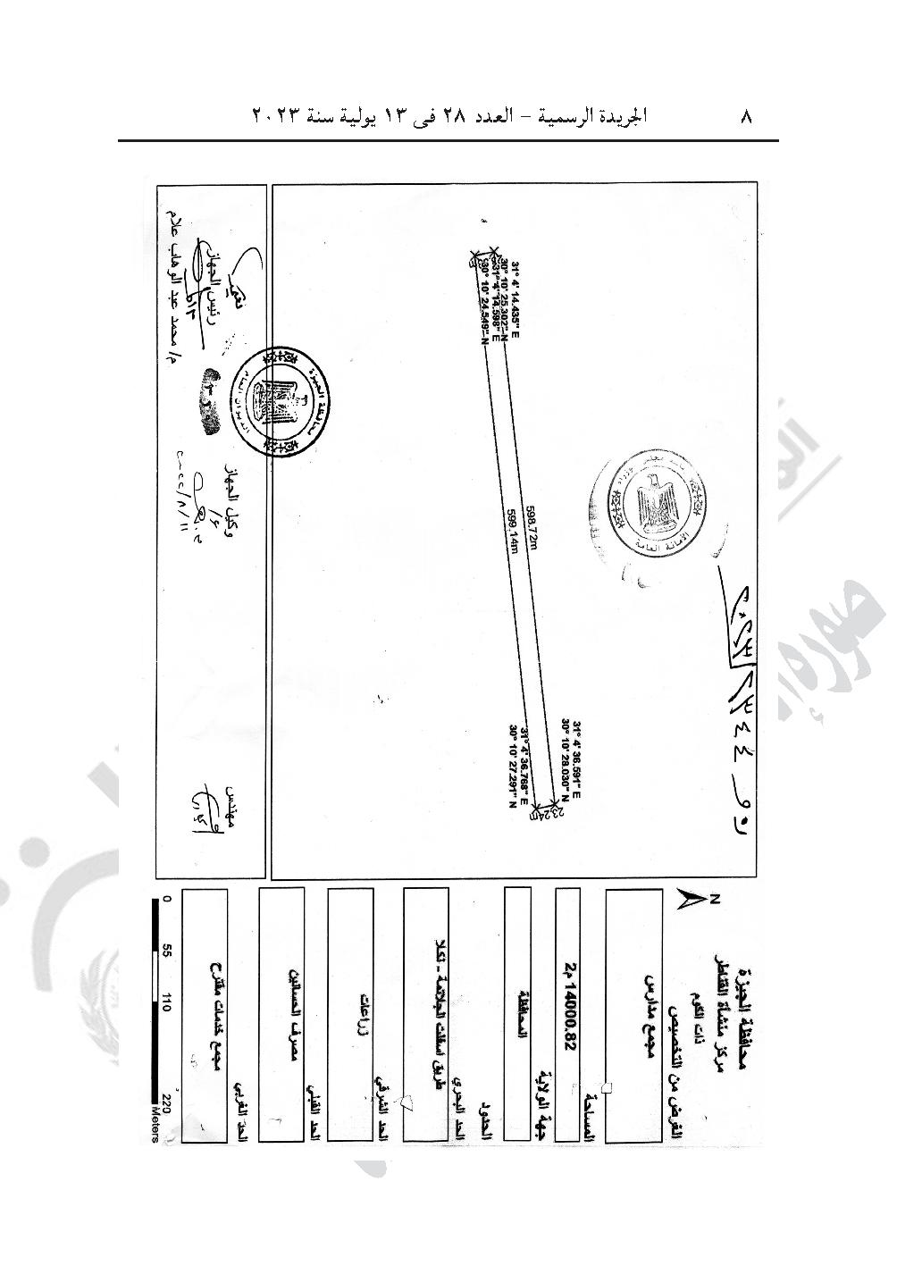 -قرار رئيس الوزراء رقم 2344 لسنة 2023، بتخصيص قطعة أرض من أملاك الدولة الخاصة بمساحة 14000٫82 متر مربع، ضمن حوضى الرزقة القبلية والجنان نمرة (10) والقصلة الكبرى نمرة (11) ناحية قرية ذات الكوم، التابعة للوحدة المحلية لمركز ومدينة منشأة القناطر، محافظة الجيزة بالمجان، لصالح الهيئة العامة للأبنية التعليمية لإقامة مجمع مدارس عليها، وفقًا للحدود والأبعاد المبينة بالرسم الكروكى.