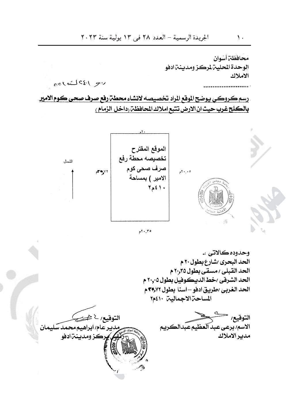 -وقـرار رئيس مجلس الوزراء رقـم 2401 لسنة 2023، بتخصيص قطعة أرض من أملاك الدولة الخاصة بمساحة 411 مترا مربعا، كائنة ناحية قرية الكلح غرب، التابعة للوحدة المحلية لمركز ومدينة إدفو، بمحافظة أسوان، بالمجان، لصالح الهيئة القومية لمياه الشرب والصرف الصحى، لإقامة محطة صرف كوم الأمير عليها، وفقا للحدود والأبعاد المبينة بالرسم الكروكى.